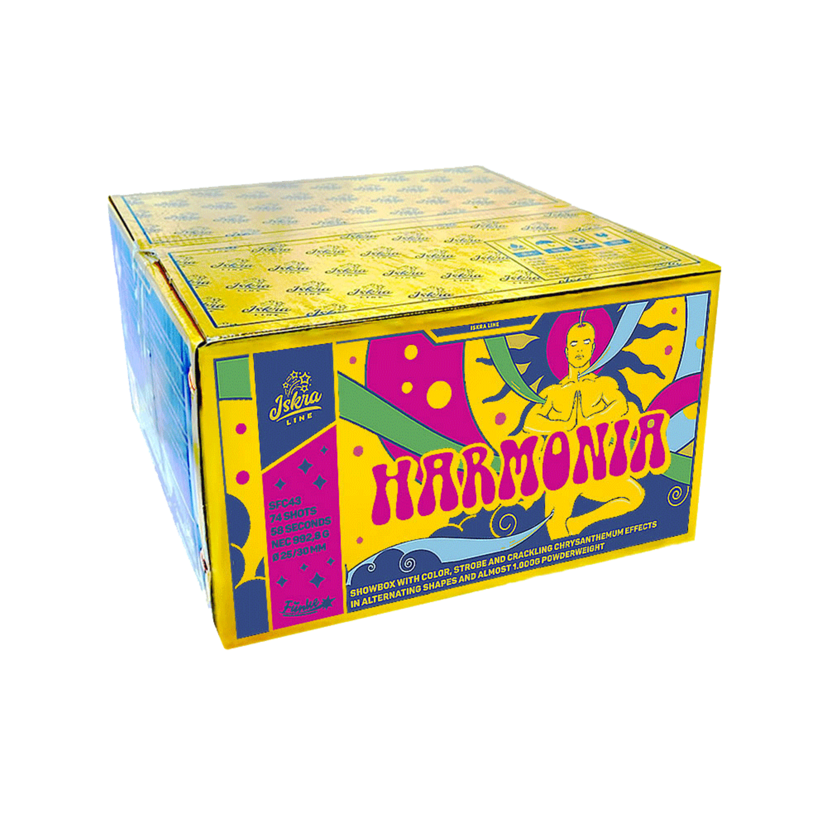 Showbox mit Farb-, Stroboskop- und knisternden Chrysanthemeneffekten in wechselnden Formen und fast 1.000 g Pulvergewicht.